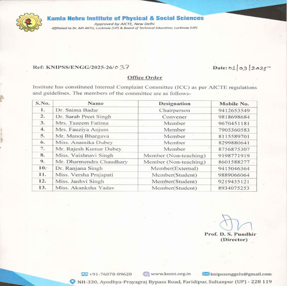 According to the University Grants Commission (Prevention, Prohibition and Redressal of Sexual Harassment of Women Employees and Students)Act of 2013, the KNIPSS Engineering Institute is committed to maintain and create a healthy, safe and conducive work environment free of sexual harassment, exploitation and intimidation for its women employees and students. At KNIPSS, we have zero-tolerance for sexual harassment. Any form of sexual harassment, particularly against women (employees and students) is not acceptable within the organization, beyond the confines of its offices, and at other locations travelled/visited for KNIPSS’s work. To ensure the above-mentioned, KNIPSS follows the 'Act' and ‘Rules’ (Policy) framed under the UGC (Prevention, Prohibition and Redressal of Sexual Harassment of Women Employees and Students) Act of 2013 through ICC. The Institute has constituted Internal Complaints Committee (ICC) which comprise of members as per the sub regulation (1) of regulation (4) of the Notification (New Delhi, the 02 May, 2016, University Grants Commission (Prevention, prohibition and redressal of sexual harassment of women)*. The policy is applicable to all the Stakeholders (explicitly or by inference) of KNIPSS, who visit KNIPSS’s and or live in its premises. All are mandated to follow this Policy and work collaboratively to prevent sexual harassment of women at KNIPSS Engineering Institute. The alteration or amendment or rescind any of the clauses through new guidelines/orders issued by Government of India regarding the Act will form part of the policy and the same will be intimated to the employees.